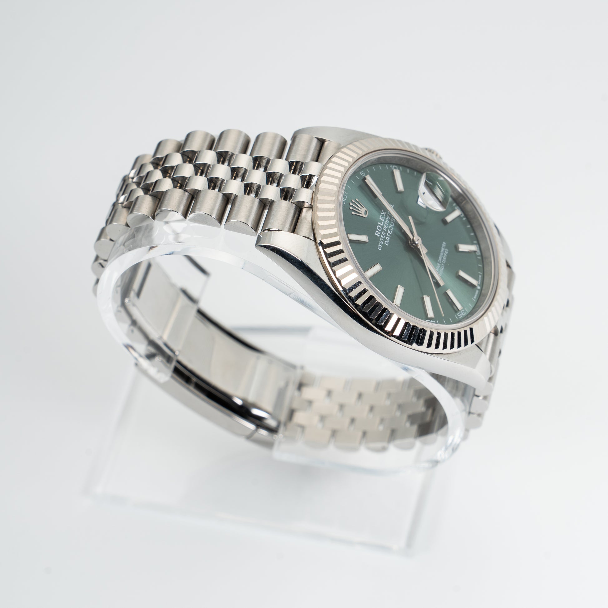 This is a Rolex Datejust 41 Ref. 126334, circa 2025. A standout modern Datejust variant, this piece features the coveted mint green dial, adding a vibrant yet elegant touch to Rolex’s classic design language. The 41mm stainless steel case is complemented by an 18k white gold fluted bezel, creating a bold yet timeless aesthetic.