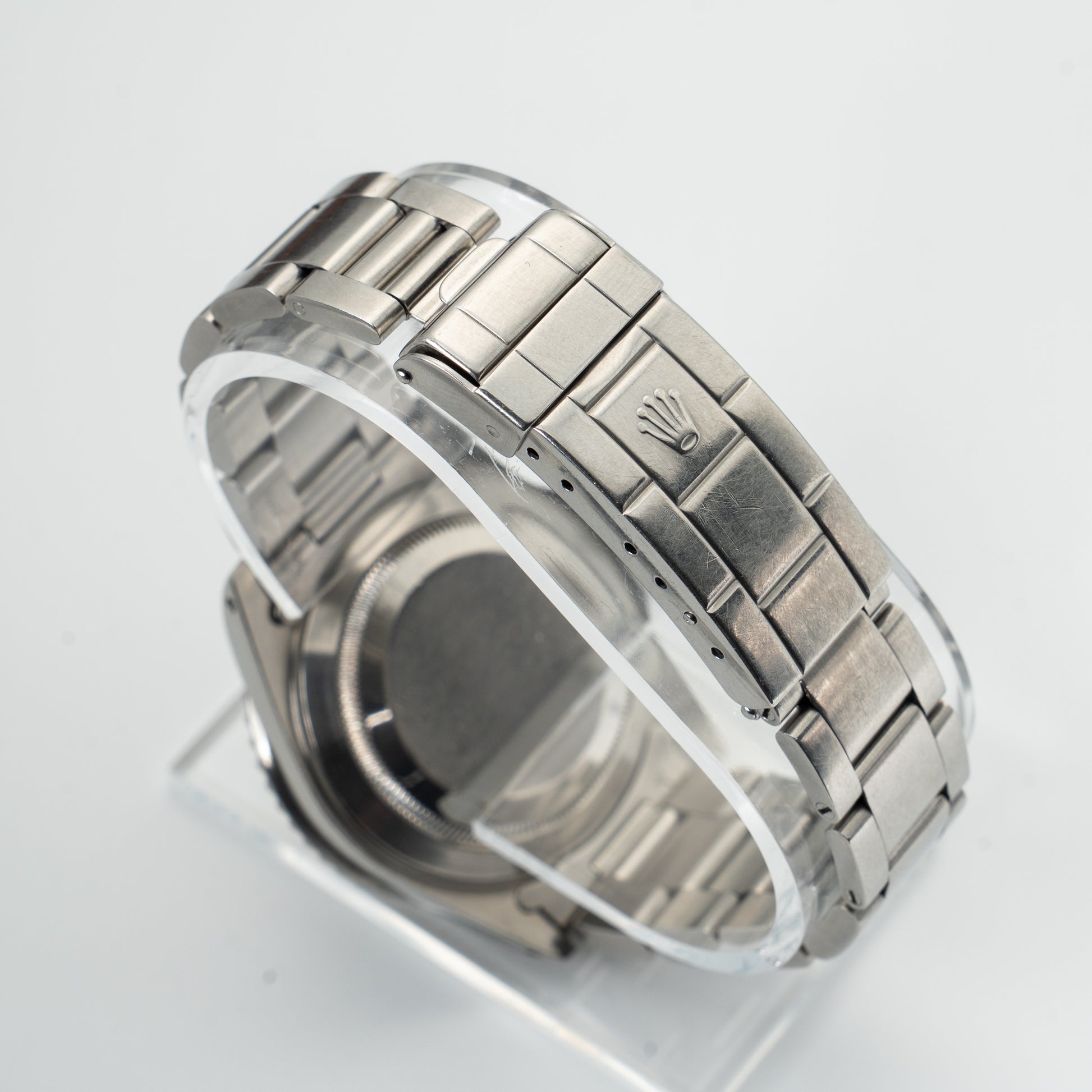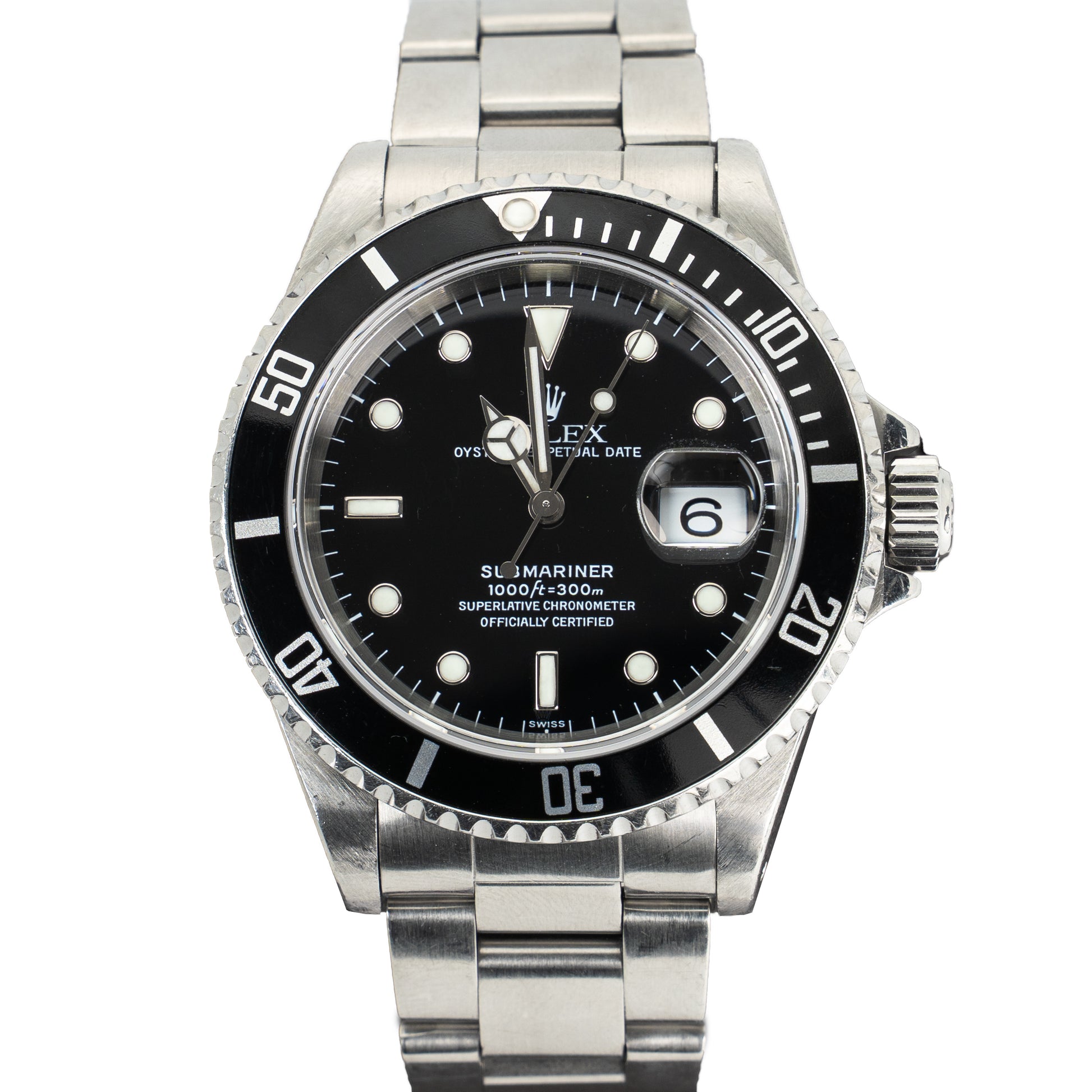 This is a Rolex Submariner Date Ref. 16610, circa 1997. A quintessential Rolex diver, this model is known for its 40 mm stainless steel case, iconic black dial with luminous hour markers, and unidirectional bezel. It houses the reliable Rolex Caliber 3135 automatic movement and offers 300 m of water resistance. This example comes complete with box and papers, making it a strong collector piece.