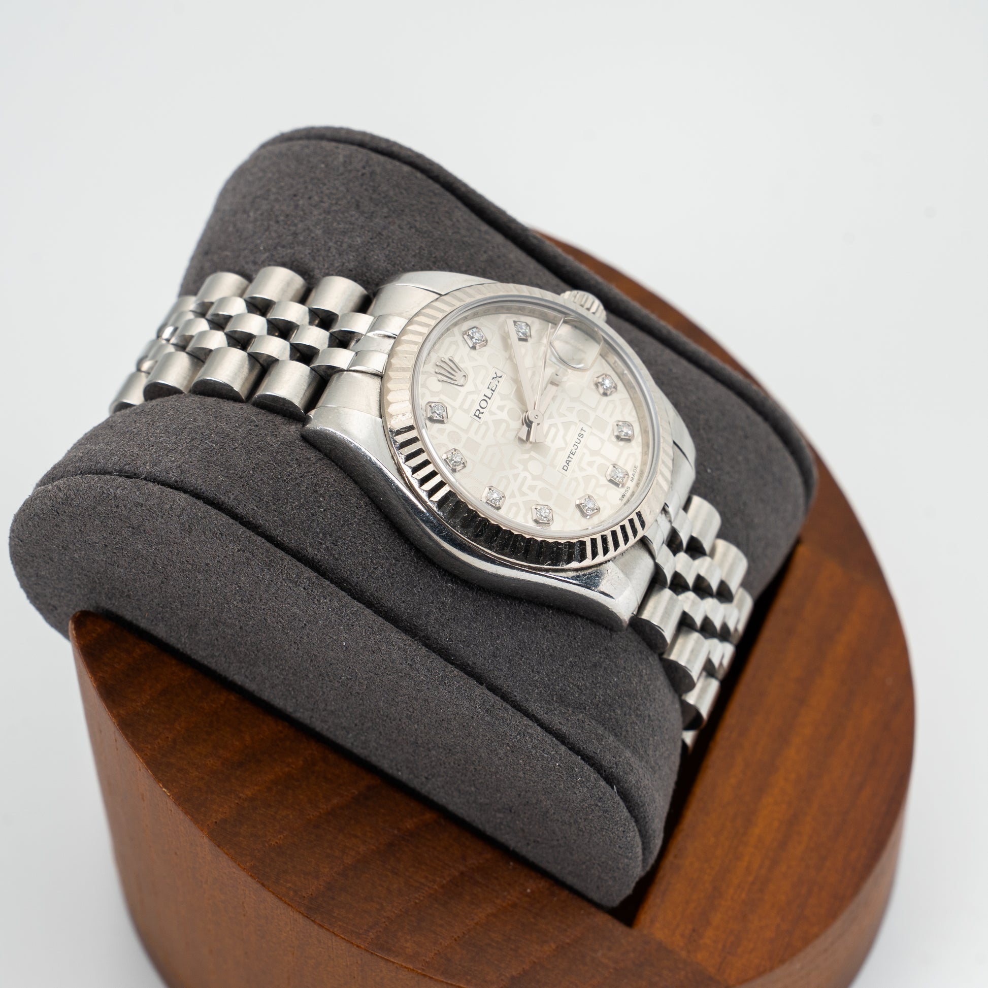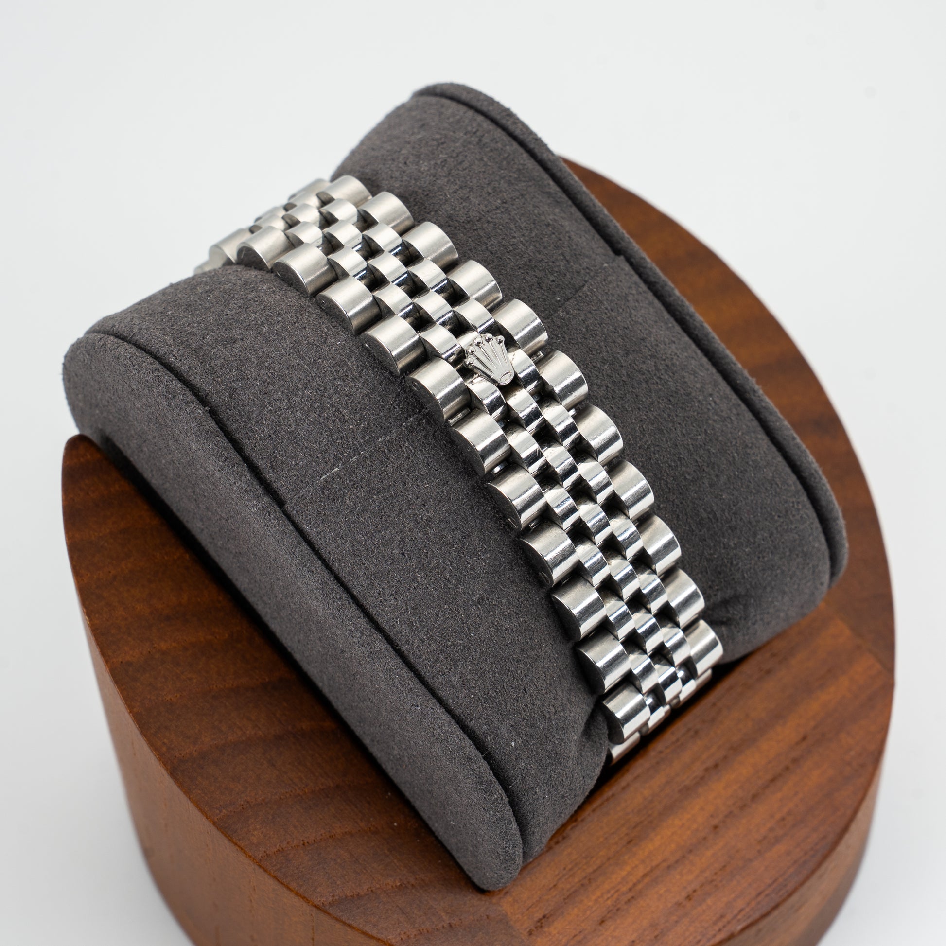 This is a Rolex Datejust Ref. 178274, circa 2008. A sophisticated 31mm midsize model that blends timeless Rolex design with refined luxury. The watch features a factory diamond-set black computer dial, framed by an 18k white gold fluted bezel. It houses the Rolex Caliber 2235 automatic chronometer movement, making it both stylish and precise. Paired with a comfortable Jubilee bracelet, this piece is a perfect balance of elegance and everyday wearability.