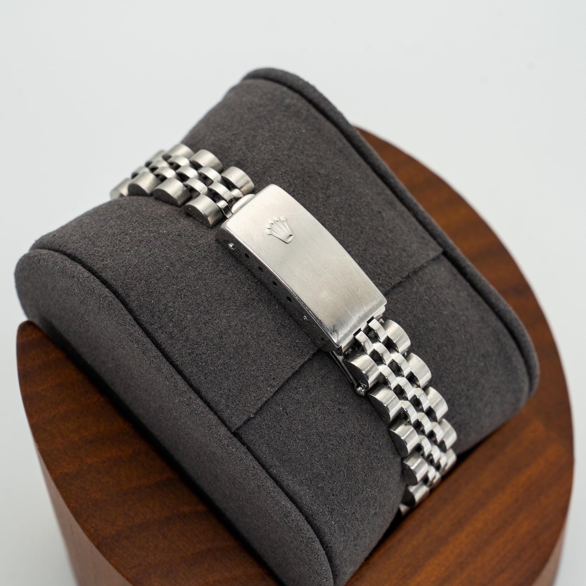 This is a Rolex Lady-Datejust Ref. 79174, circa 1999. A timeless classic, this 26mm stainless steel timepiece features an elegant 18k white gold fluted bezel and a white Roman numeral dial, offering refined contrast and vintage charm. Powered by the Rolex Caliber 2235 automatic movement and paired with a durable Oyster bracelet, it blends everyday reliability with understated sophistication.