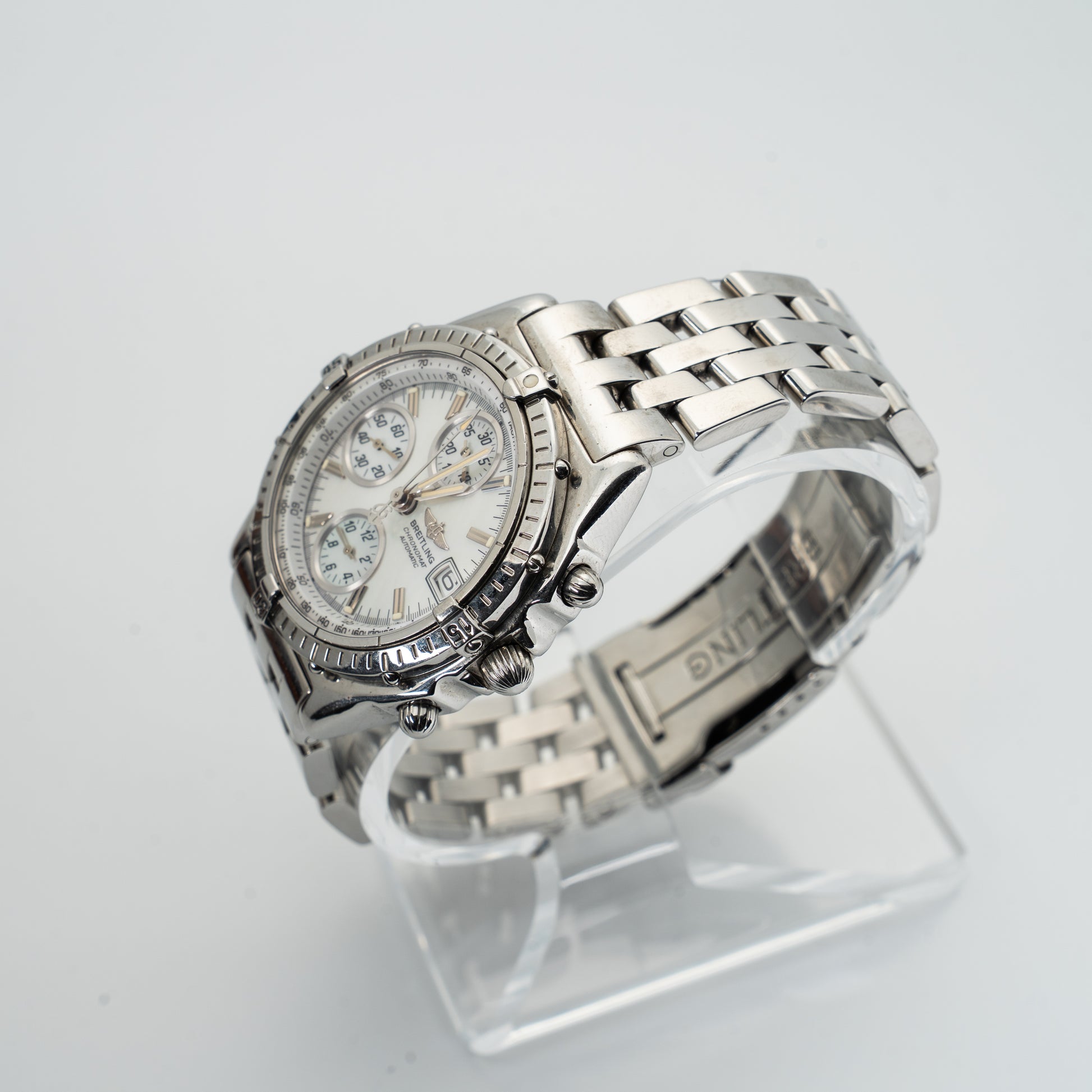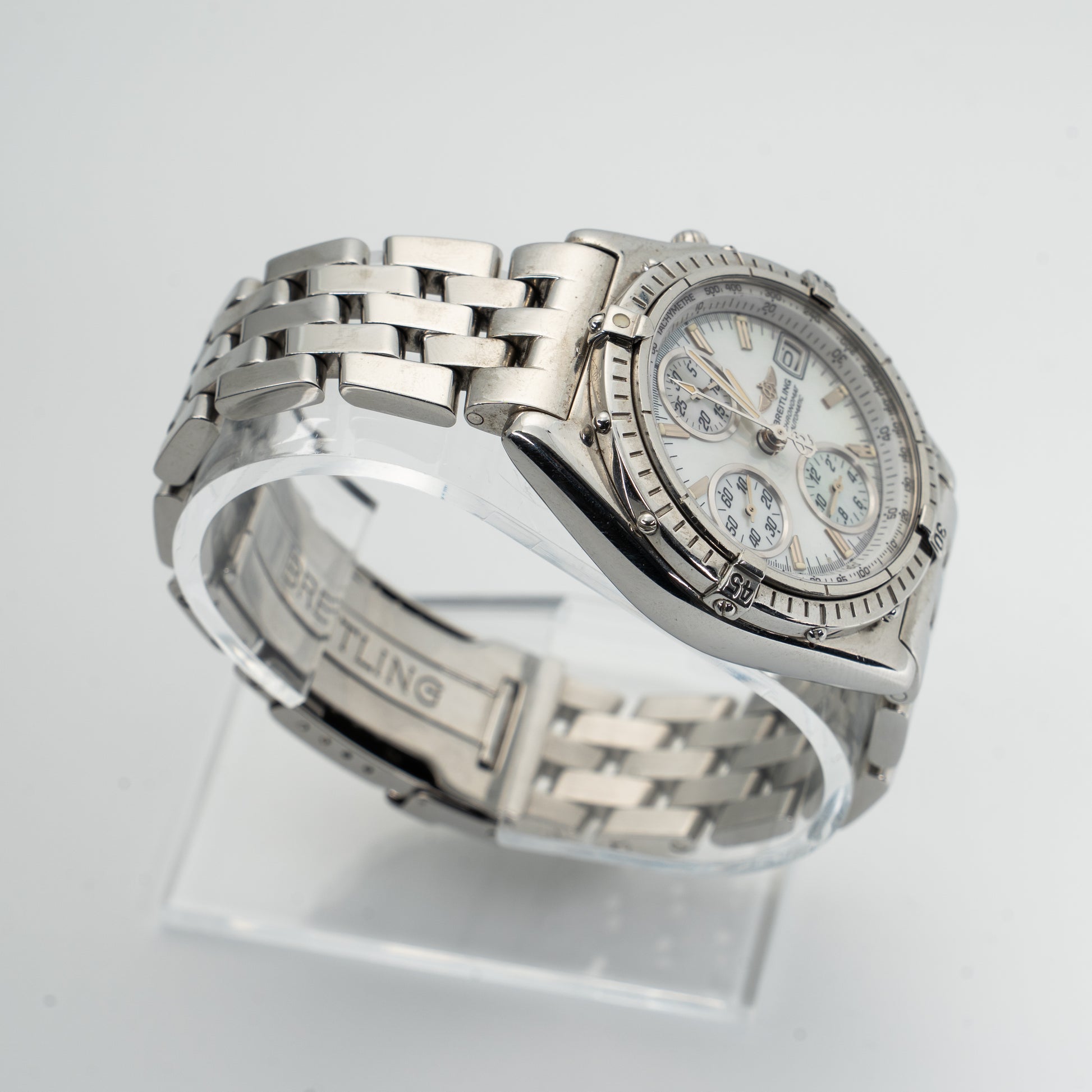 This is a Breitling Chronograph Ref. A13050, circa 2005. Showcasing a distinctive mother of pearl dial and classic chronograph layout, this timepiece blends sporty functionality with elegant style. Housed in a stainless steel case and powered by a Breitling automatic chronograph movement, it’s ideal for collectors and enthusiasts alike. Includes original box (damaged) and papers.