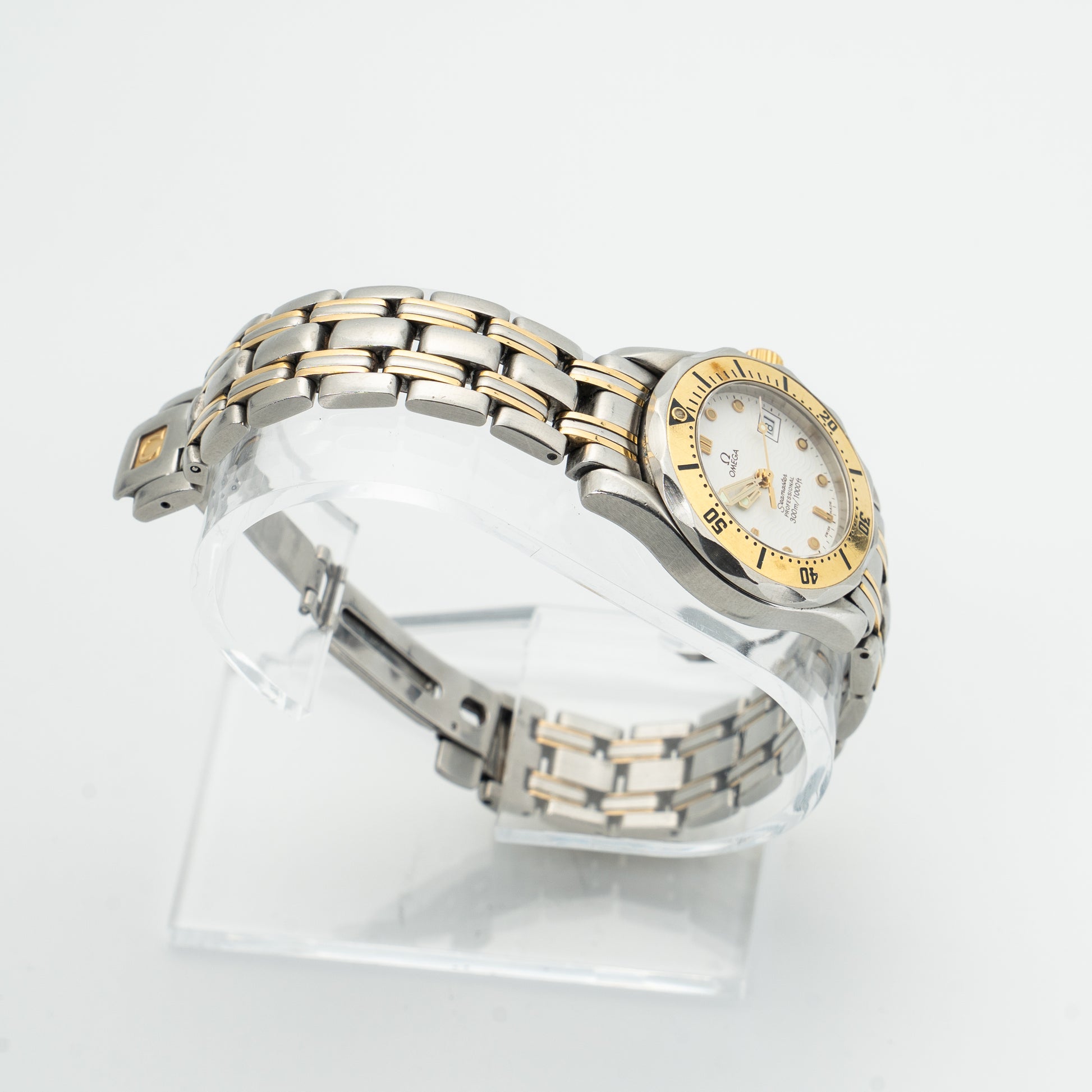 This is an Omega Seamaster Ref. 2382.20, a classic ladies’ Seamaster Diver 300 M model crafted in stainless steel and 18k yellow gold. Featuring a compact 28 mm case and quartz movement, this reference is a refined yet sporty piece. Designed with a two-tone bracelet and rotating diver’s bezel, it’s a versatile choice for elegant daily wear with dive watch utility.