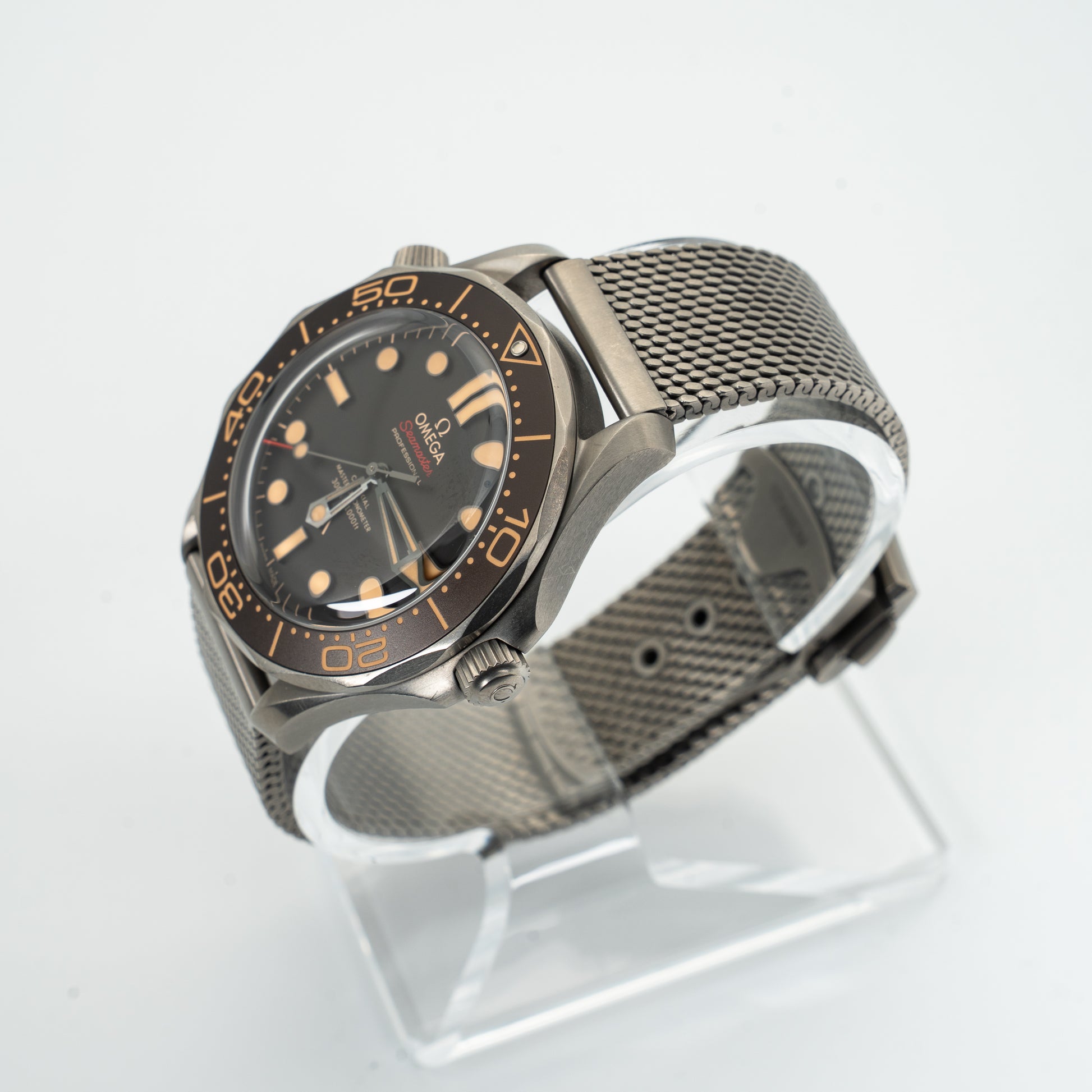This is the Omega Seamaster Diver 300M 007 Edition, Ref. 210.90.42.20.01.001. Designed in collaboration with Daniel Craig for the James Bond film No Time to Die, this lightweight dive watch features a 42mm Grade 2 titanium case, brown tropical aluminum dial and bezel, and a domed sapphire crystal. It is powered by the Omega Caliber 8806 automatic movement, visible through a closed solid caseback with military-style engraving. The watch has a distinctive vintage military aesthetic and excellent wearability due to its slim profile and lightweight construction.