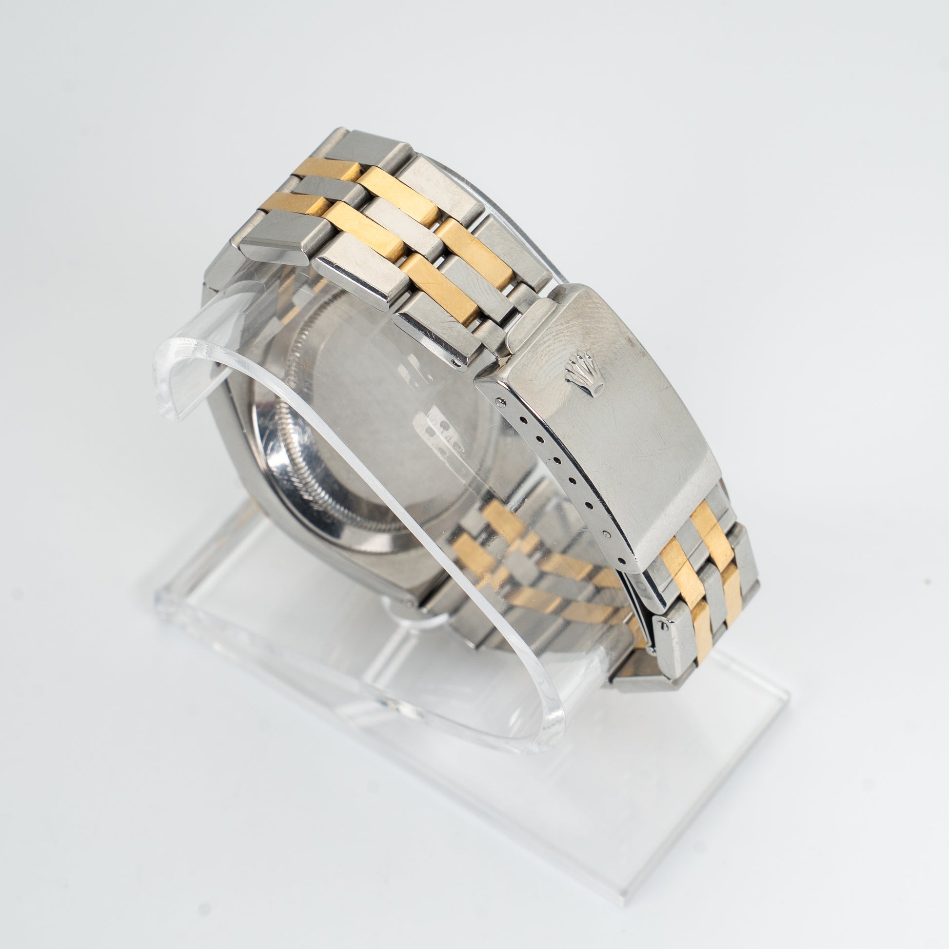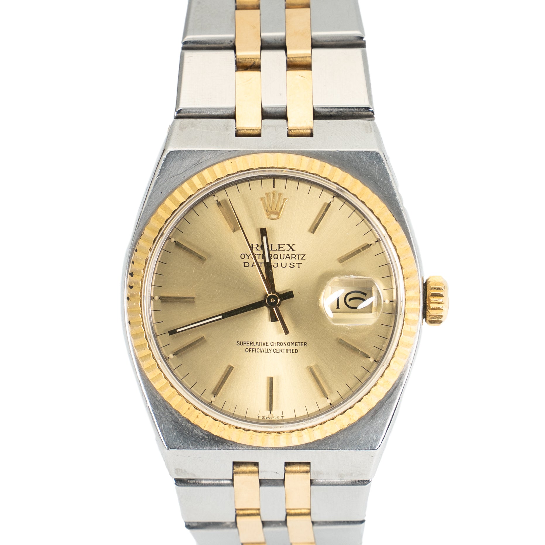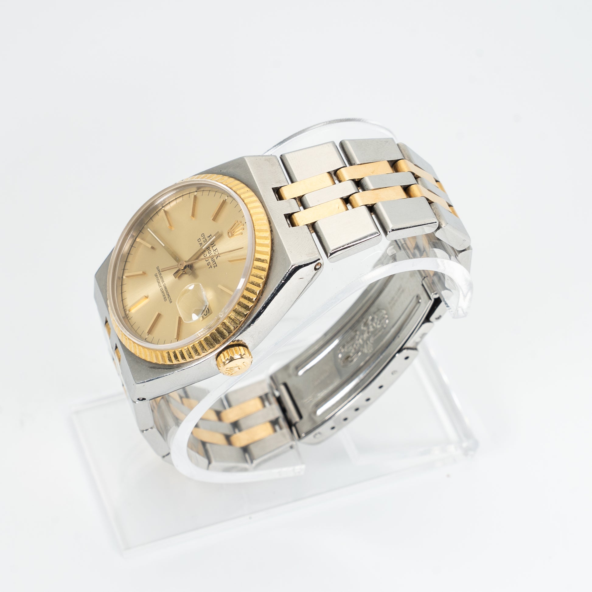 This is a Rolex Oysterquartz Datejust Ref. 17013, circa 1980s. A distinctive and collectible model, the Oysterquartz line stands apart in Rolex history with its integrated case design, angular bracelet, and high-precision quartz movement. This two-tone example in stainless steel and 18k yellow gold features a champagne dial, giving it a classic and refined appearance. A great choice for collectors seeking something unique within the Datejust family.