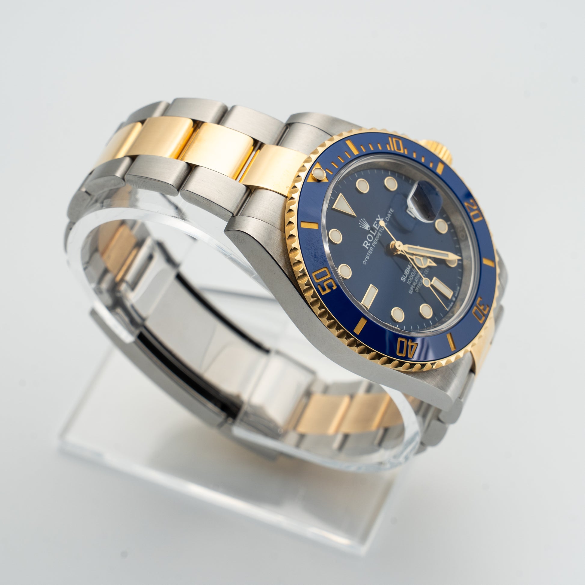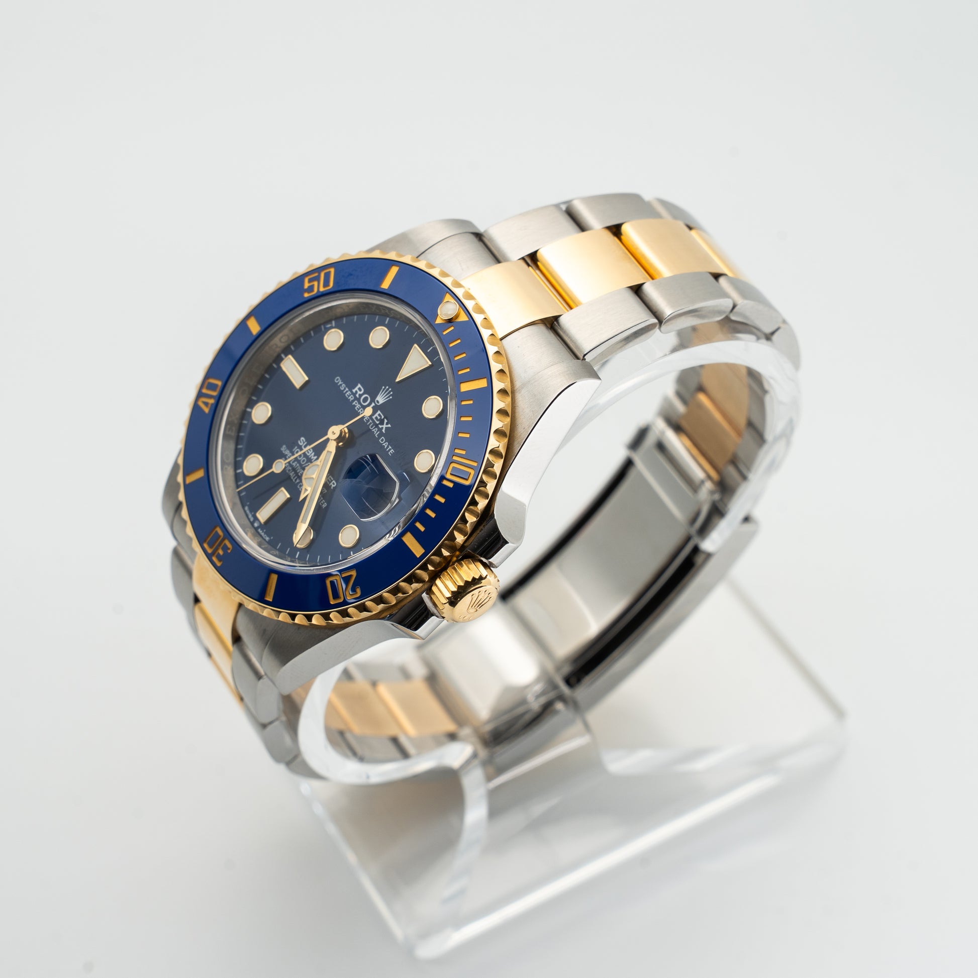 This is a Rolex Submariner Date Ref. 126613, circa 2021. Featuring the iconic combination of blue sunburst dial and matching blue Cerachrom bezel, this two-tone Submariner balances sport and luxury perfectly. Crafted in stainless steel and 18k yellow gold, the 41mm case houses the robust Caliber 3235 movement, offering enhanced accuracy and power reserve. A standout dive watch with elegant flair.