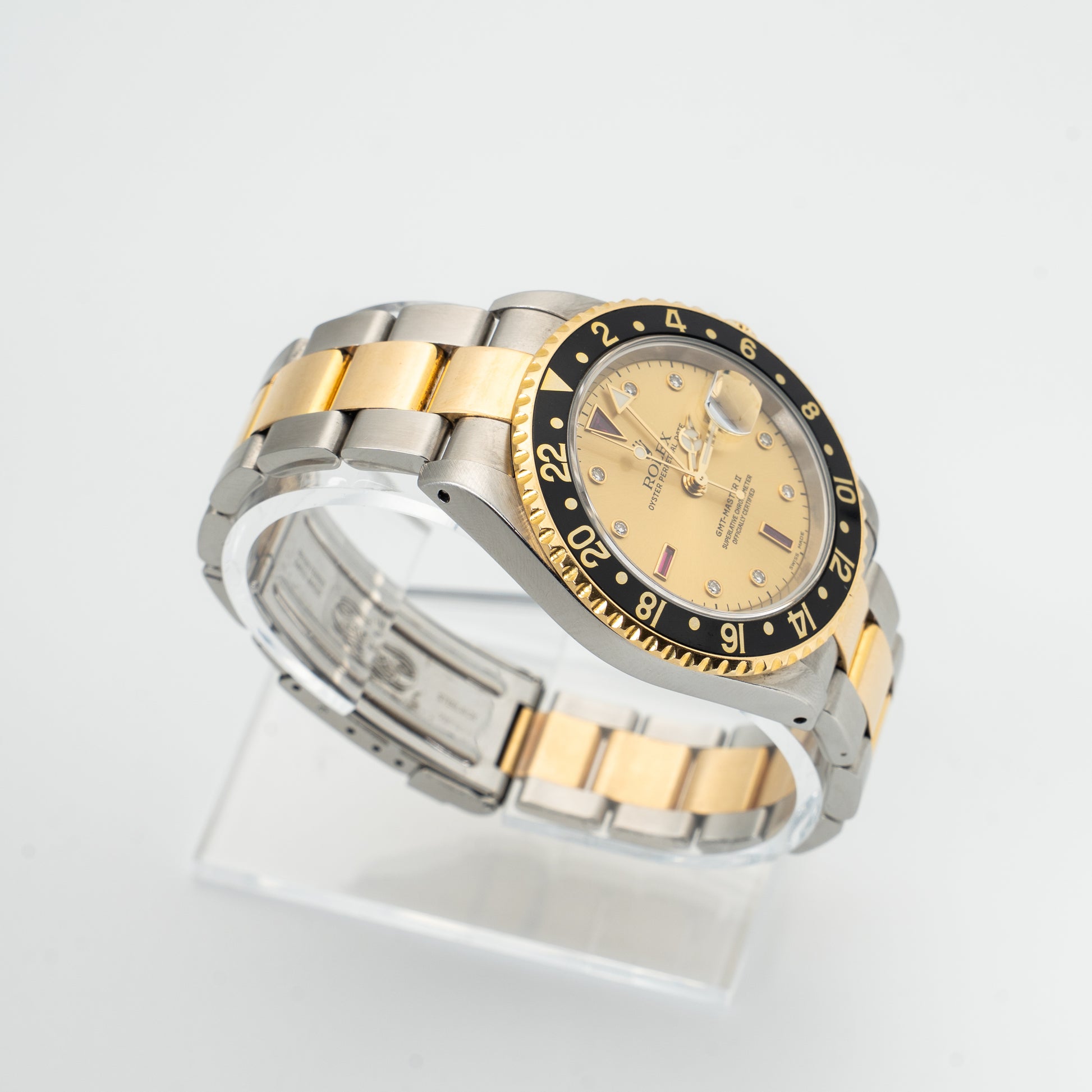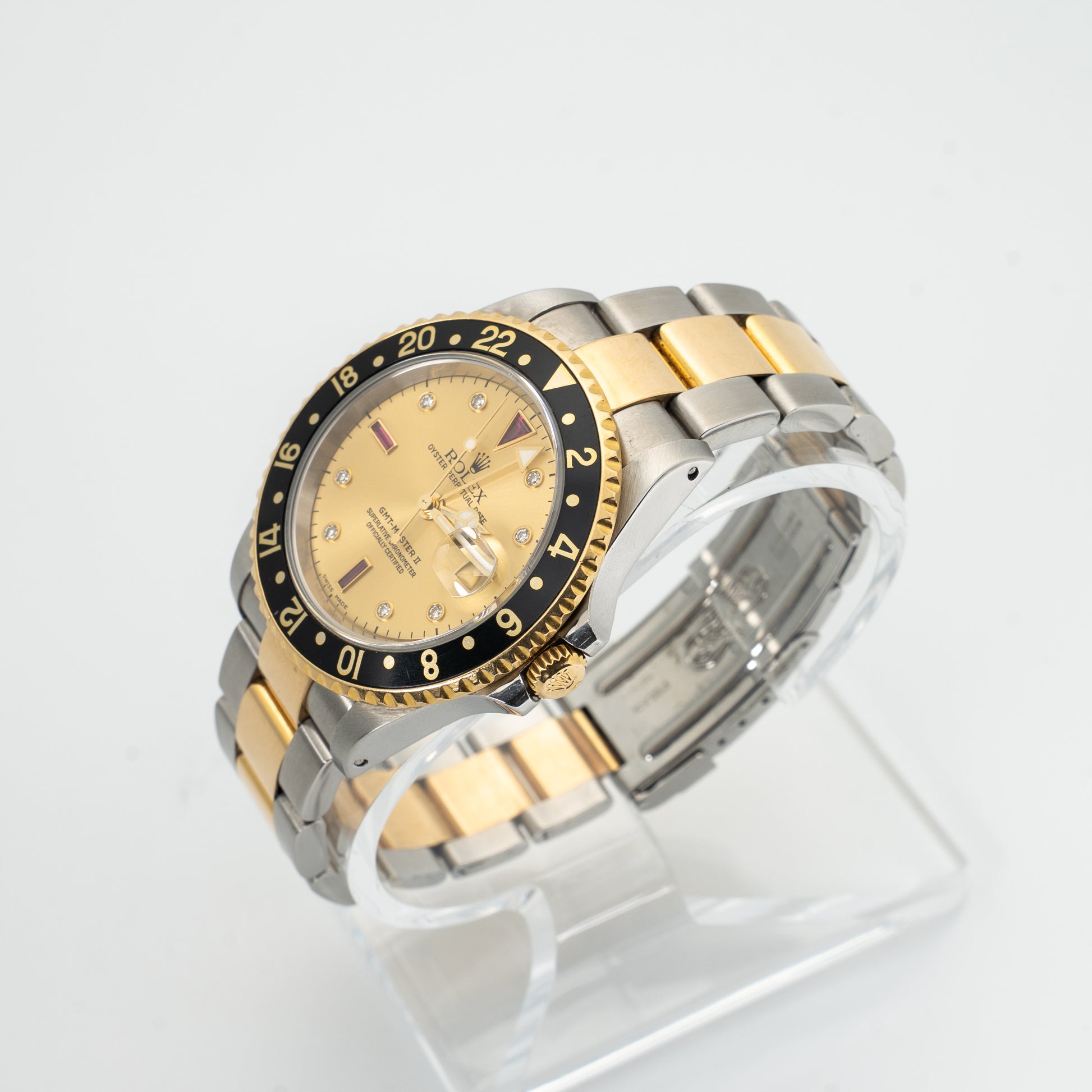 This is a Rolex GMT-Master II Ref. 16713, circa 2003, featuring the coveted factory Serti dial set with ruby hour markers and diamond indices. This model is crafted in stainless steel and 18k yellow gold, fitted with a classic Oyster bracelet and rotating two-tone bezel. As a complete set with box and papers, and in beautiful collector-grade condition, this piece is an exceptional example of a rare configuration, making it highly desirable among Rolex enthusiasts.