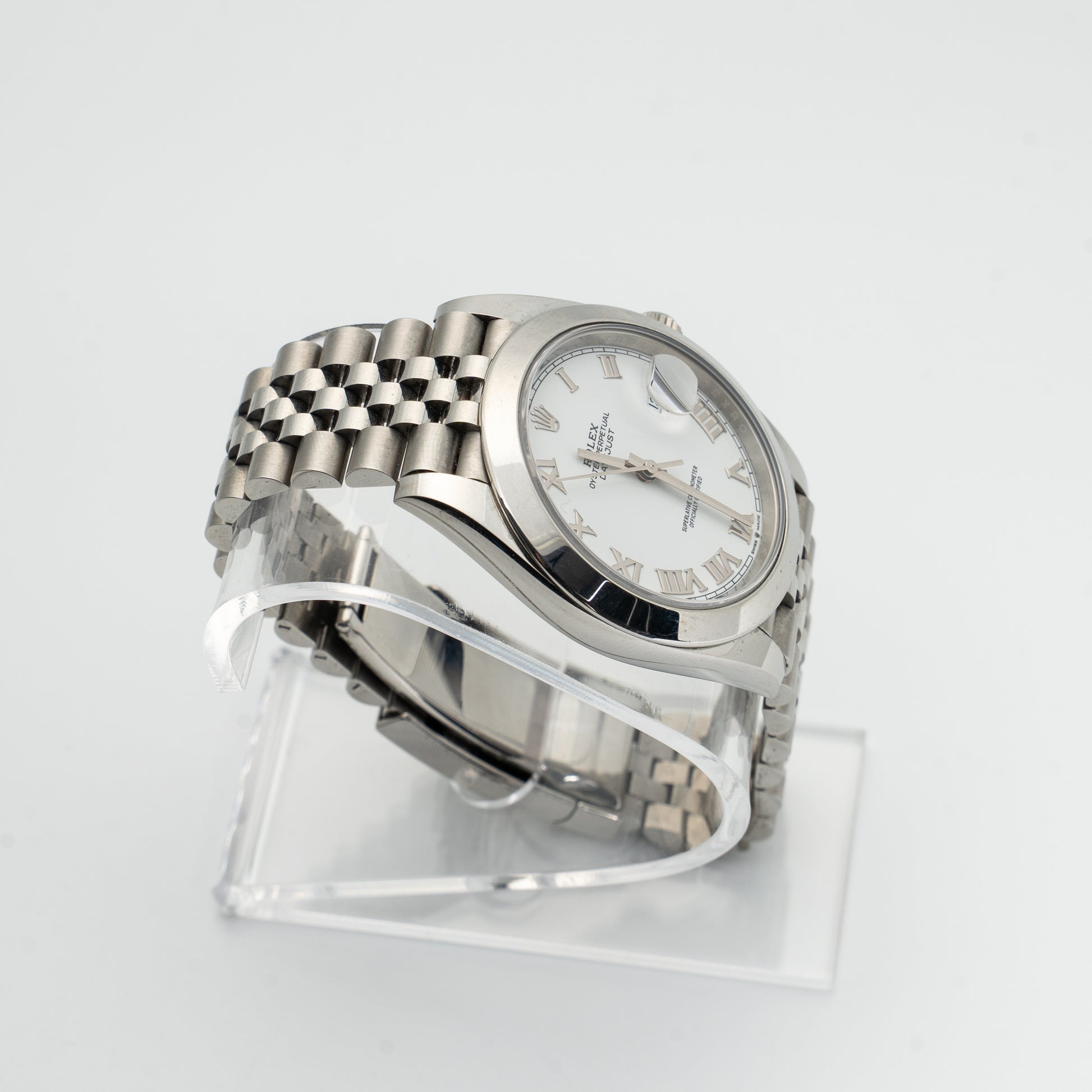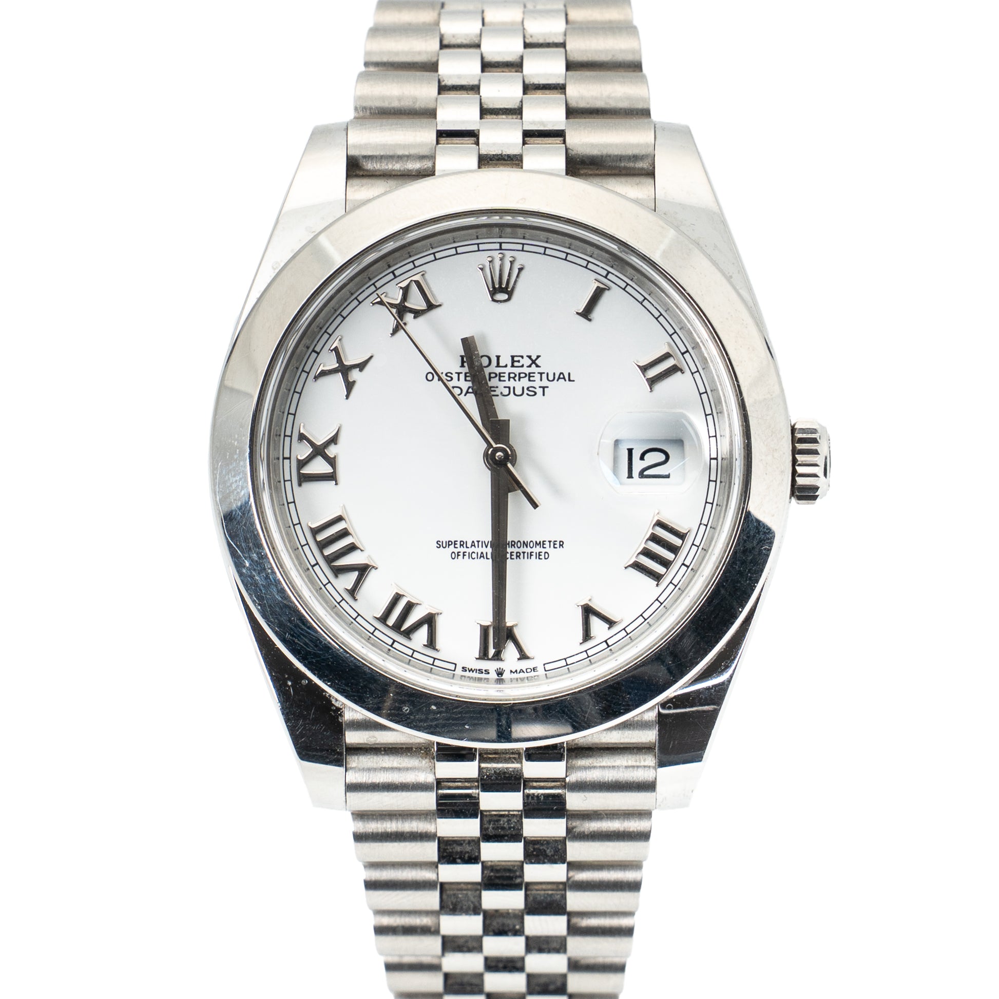 This is a Rolex Datejust Ref. 126300, circa 2021, featuring a sleek white Roman numeral dial that adds timeless elegance to this modern classic. Housed in a 41mm stainless steel case, the watch is fitted with the refined Jubilee bracelet and polished smooth bezel. Powered by the updated Rolex Caliber 3235, it delivers excellent reliability, accuracy, and a 70-hour power reserve. This complete set includes the original box and papers and is in excellent condition.