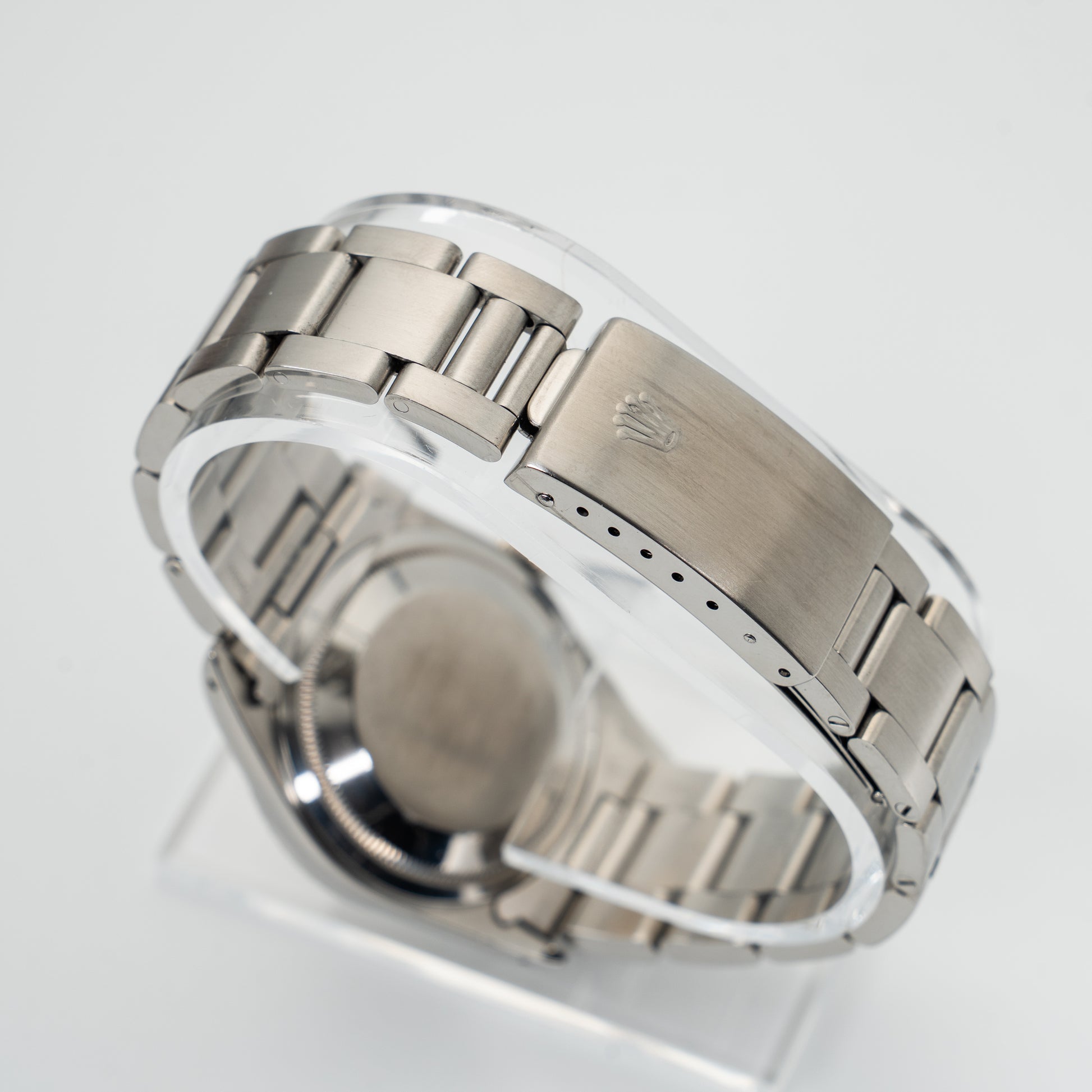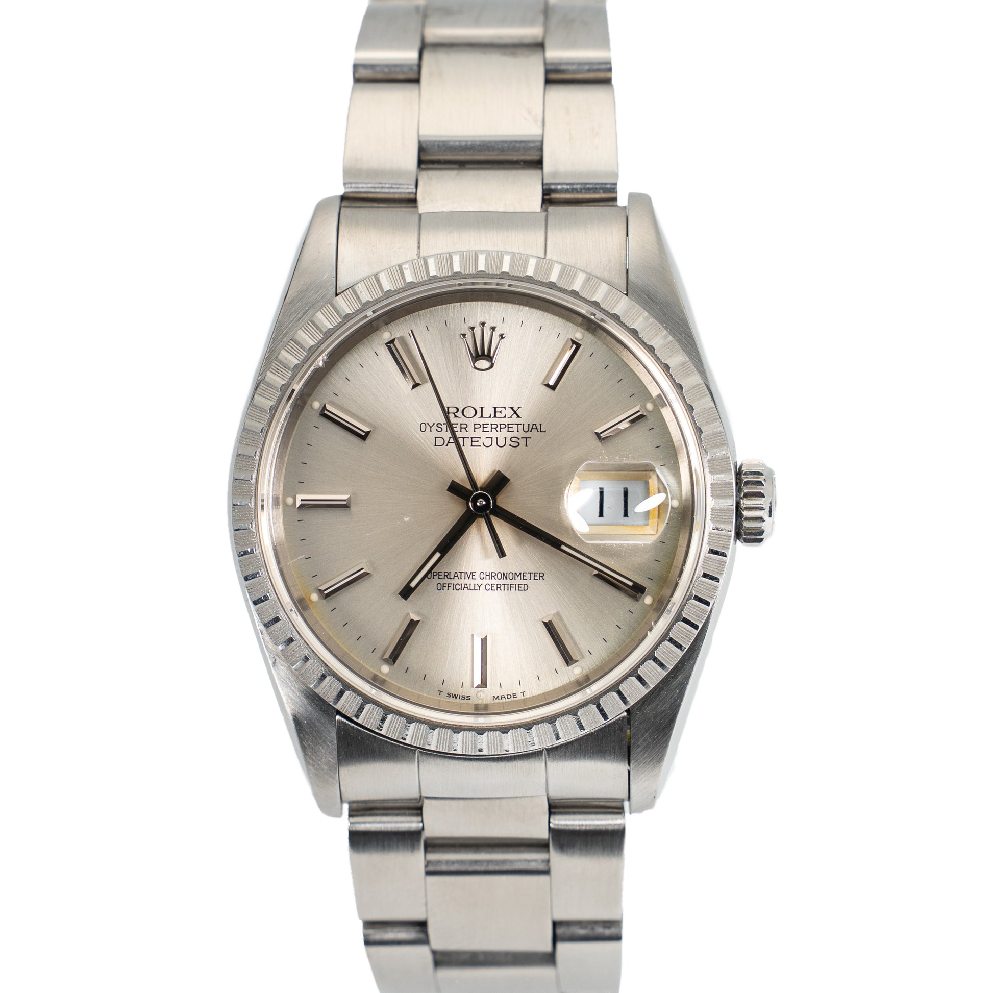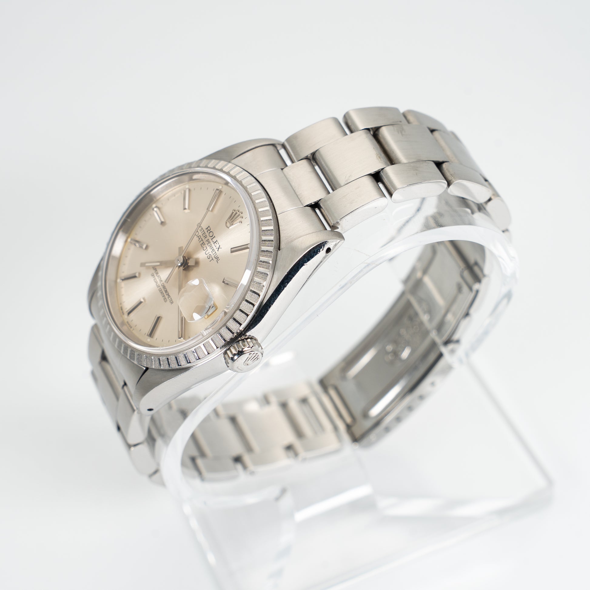 This is a Rolex Datejust Ref. 16014, circa 1991. This classic stainless steel timepiece features a fluted white gold bezel and a vintage patinated dial with light discoloration, adding unique character to its appearance. Equipped with the reliable Rolex Caliber 3035 automatic movement and housed in a 36mm case, this Datejust embodies timeless style and performance. Included with the watch is the original Rolex box (no papers). The watch is in overall very good condition, with visible signs of age limited mostly to the dial.
