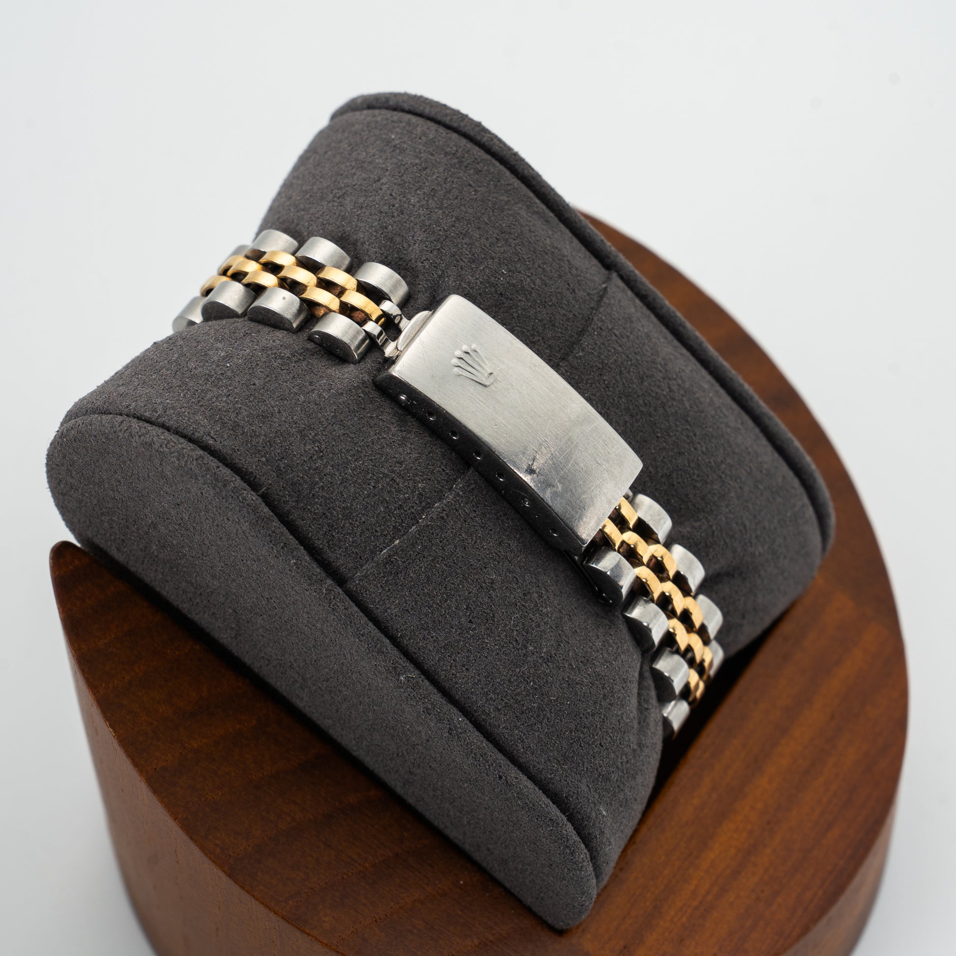 This is a Rolex Lady-Datejust Ref. 69173, circa 1986. A two-tone classic in 26mm, this example features an aftermarket black diamond dial and an aftermarket diamond bezel, adding brilliant flair to a timeless silhouette. Powered by the Rolex automatic movement, it features a jubilee bracelet with noticeable stretch due to age and wear, but remains structurally sound. A beautiful blend of elegance and functionality, perfect for collectors or everyday luxury.