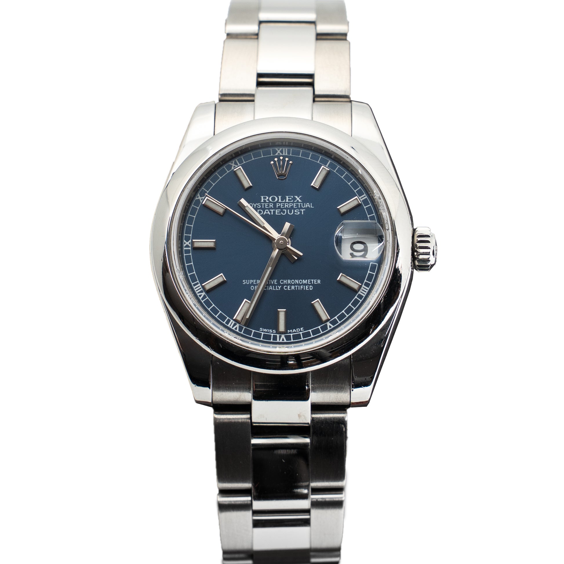 This is a Rolex Lady-Datejust Ref. 178240, featuring a crisp blue stick dial and classic 34mm stainless steel case. The smooth bezel and Oyster bracelet give this reference a sporty elegance, ideal for everyday wear or special occasions. Powered by the reliable Caliber 2235 automatic movement, this model combines timeless design with mechanical performance.