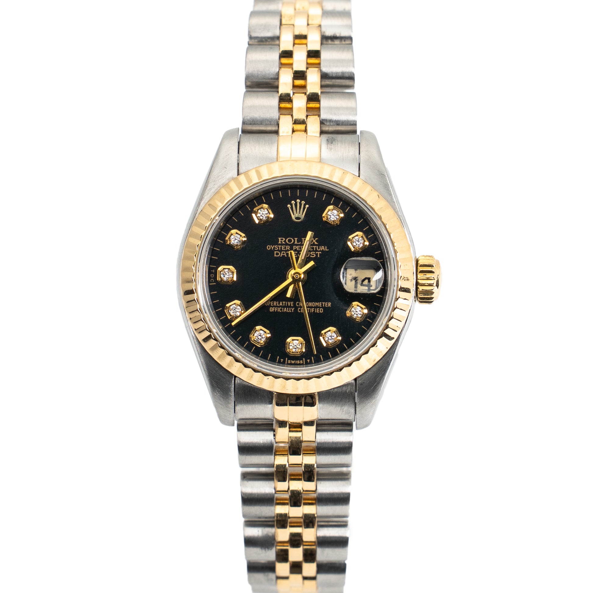 This is a Rolex Lady-Datejust Ref. 69173, a two-tone stainless steel and 18k yellow gold model from circa 1980. Featuring a black aftermarket diamond dial, the watch adds an elegant twist to a classic design. At 26mm, it’s the perfect size for a refined and understated wrist presence. Powered by the reliable automatic Rolex movement, it offers timeless luxury and functionality.