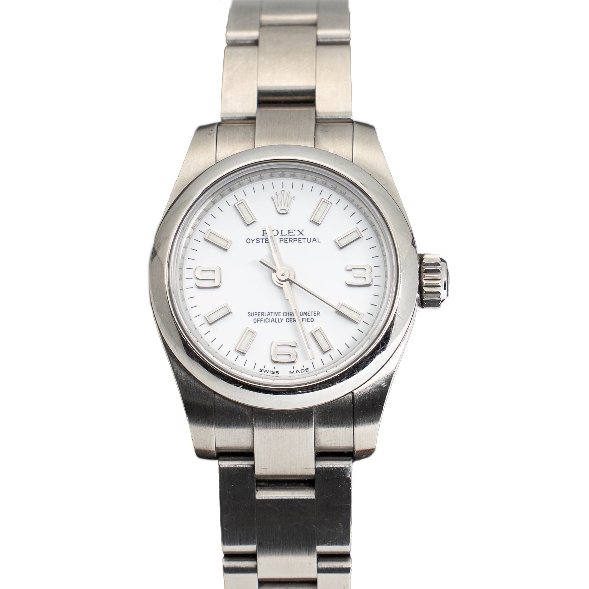This is a Rolex Oyster Perpetual Ref. 176200, circa 2012. This compact 26mm stainless steel timepiece is part of Rolex’s Oyster Perpetual line—known for its timeless design and everyday wearability. It features a clean white Arabic dial, smooth domed bezel, and is powered by the reliable Rolex Caliber 2231 automatic movement. Ideal for those seeking a smaller Rolex with enduring elegance, it comes complete with box and papers.
