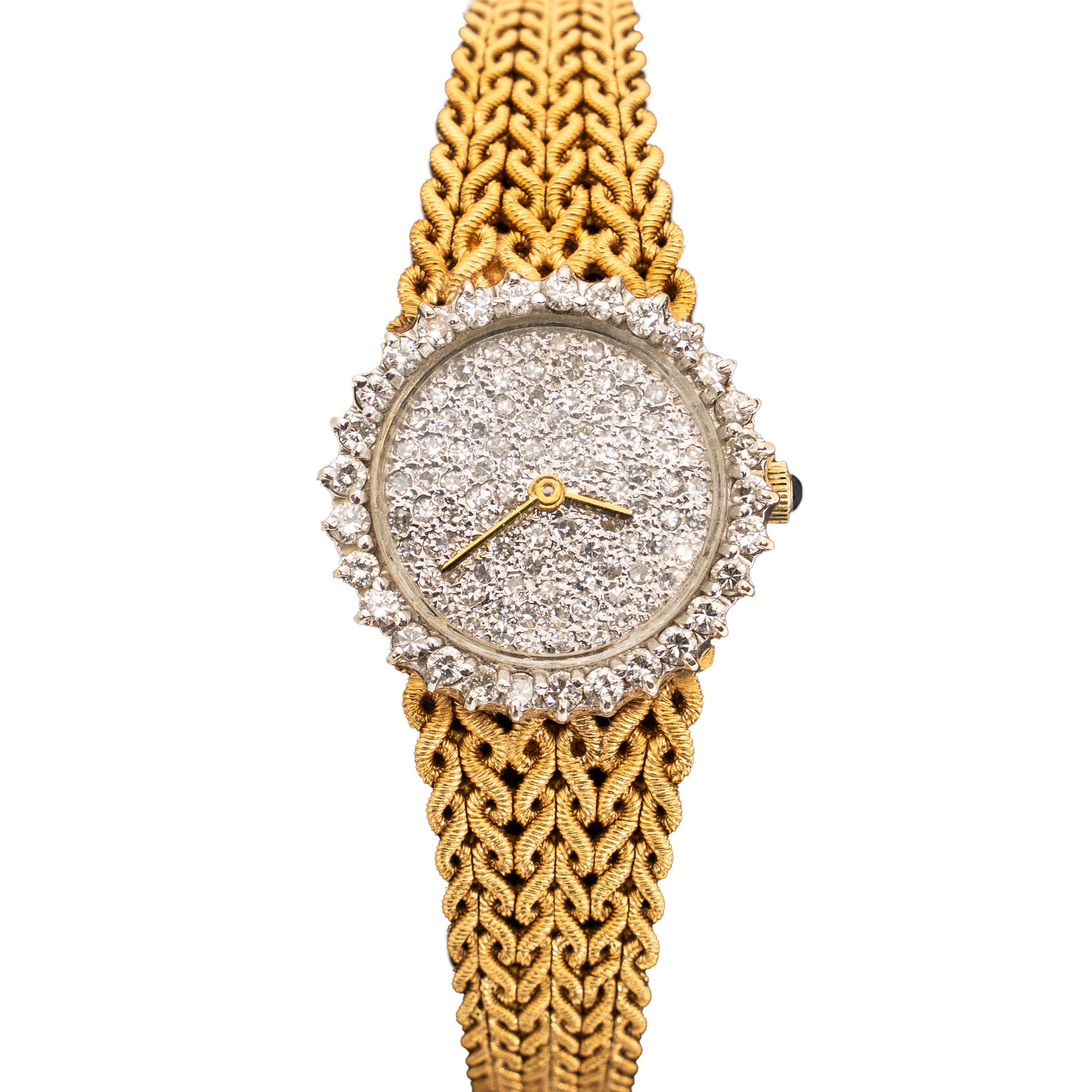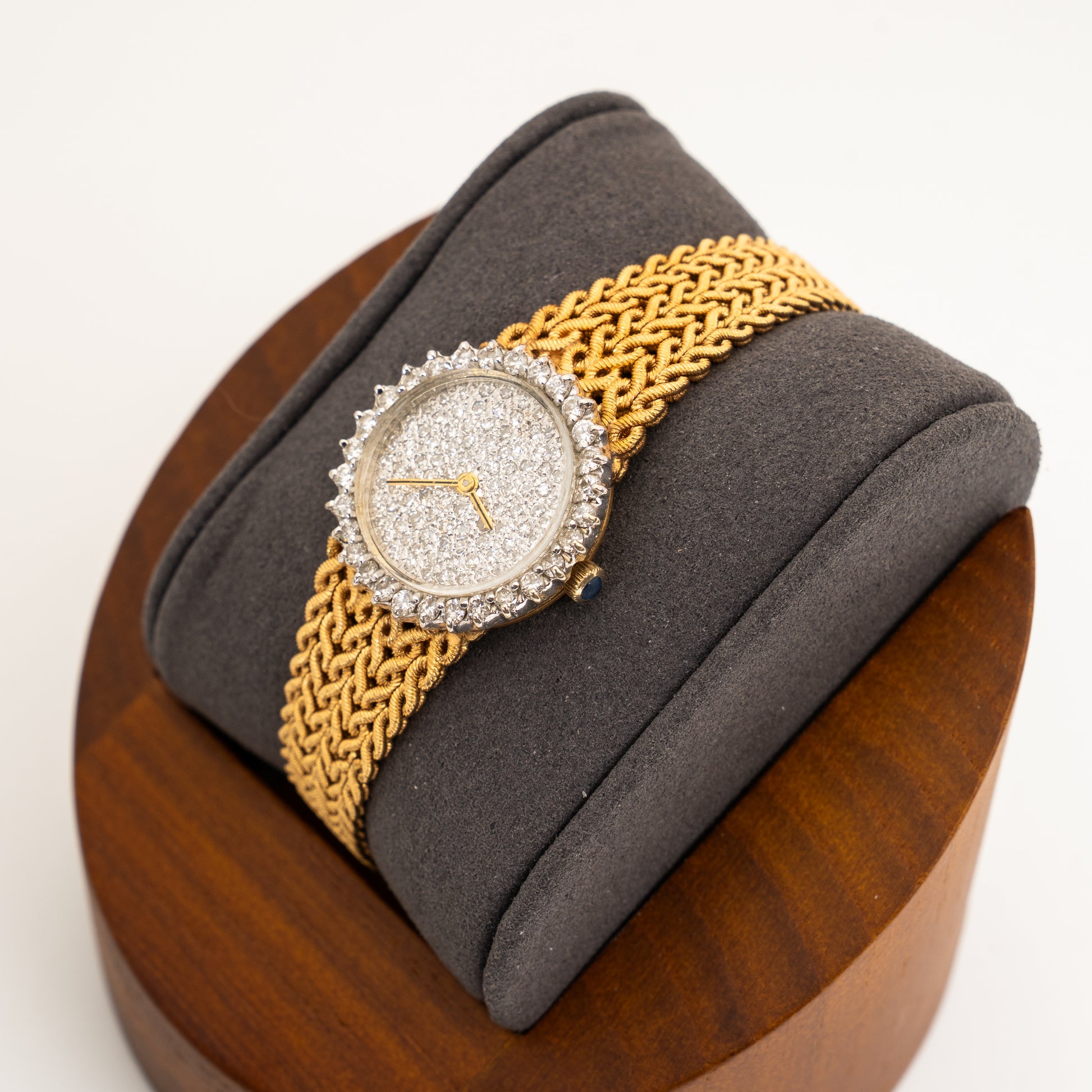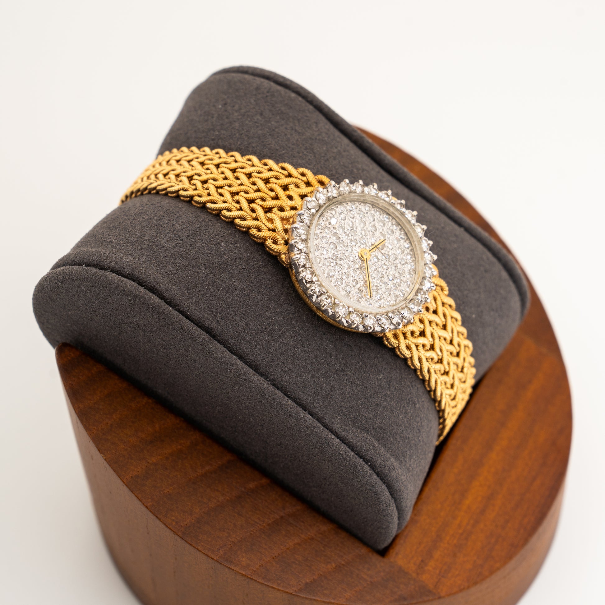 This is a vintage Lucien Piccard ladies watch, showcasing timeless elegance with luxurious details. The watch features a stunning 18kt yellow gold woven mesh bracelet and a richly set diamond pavé dial with a diamond bezel—offering over 2 carats total weight in natural diamonds. Measuring approximately 26mm in case diameter, this piece combines a delicate profile with high-impact sparkle. A true vintage showpiece with incredible wrist presence.