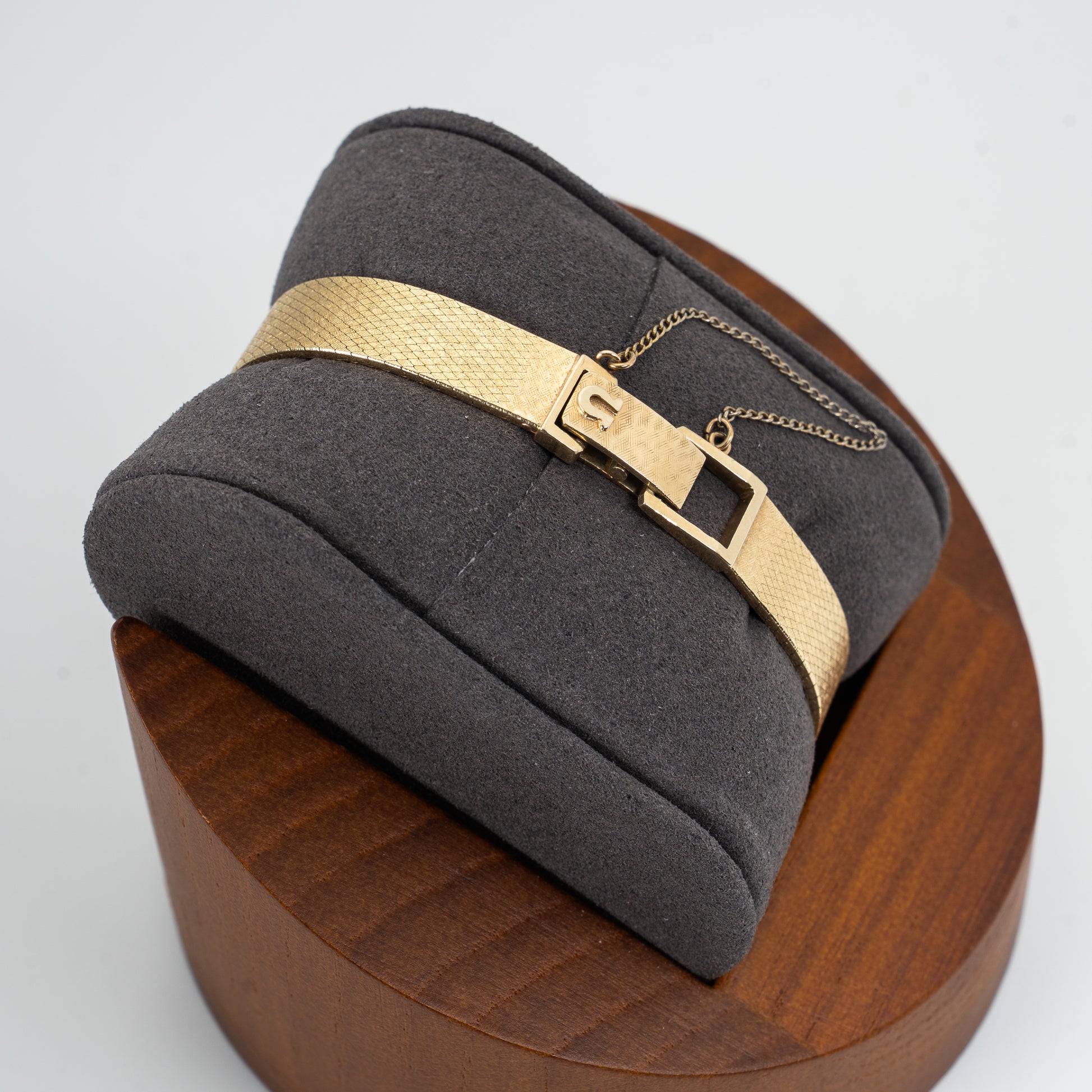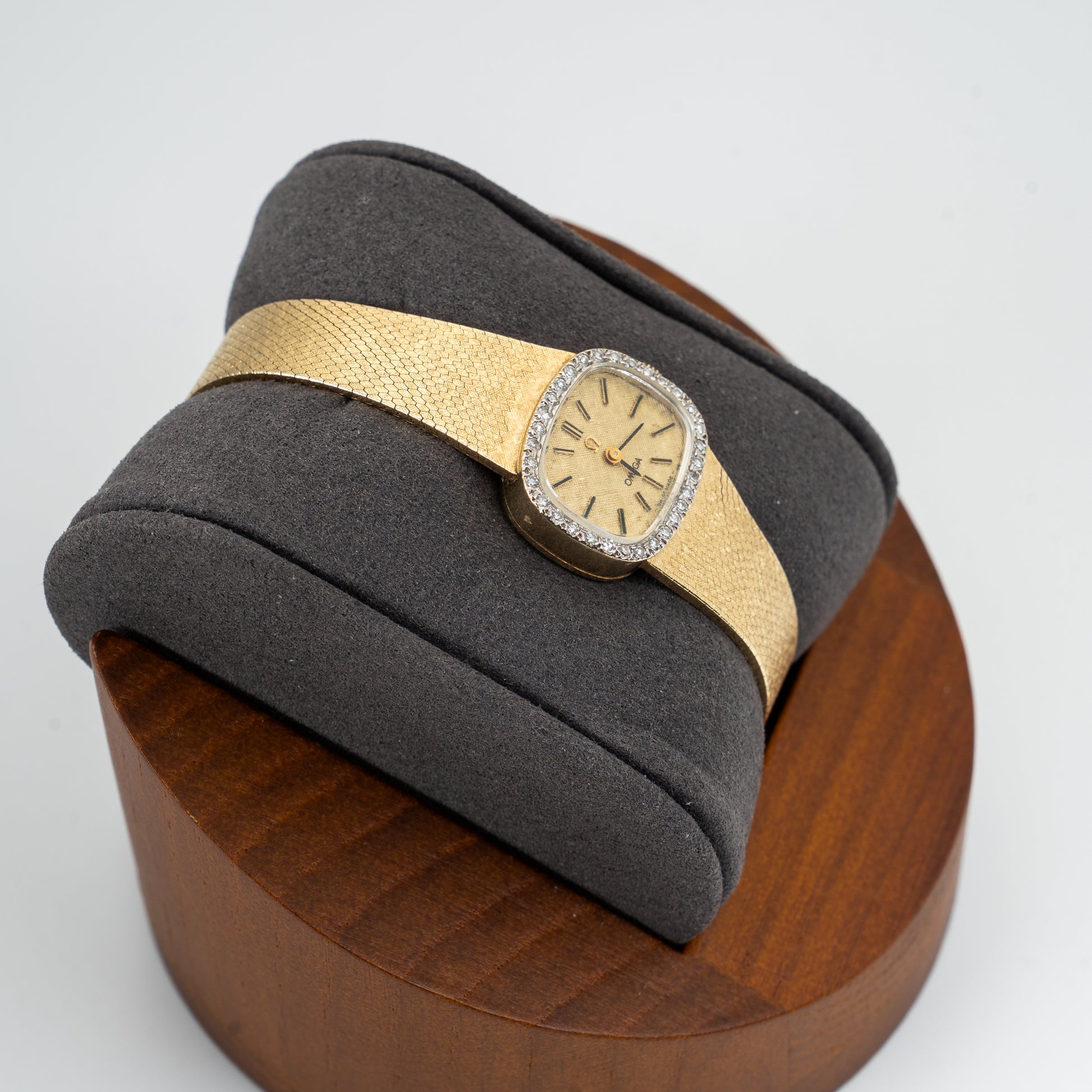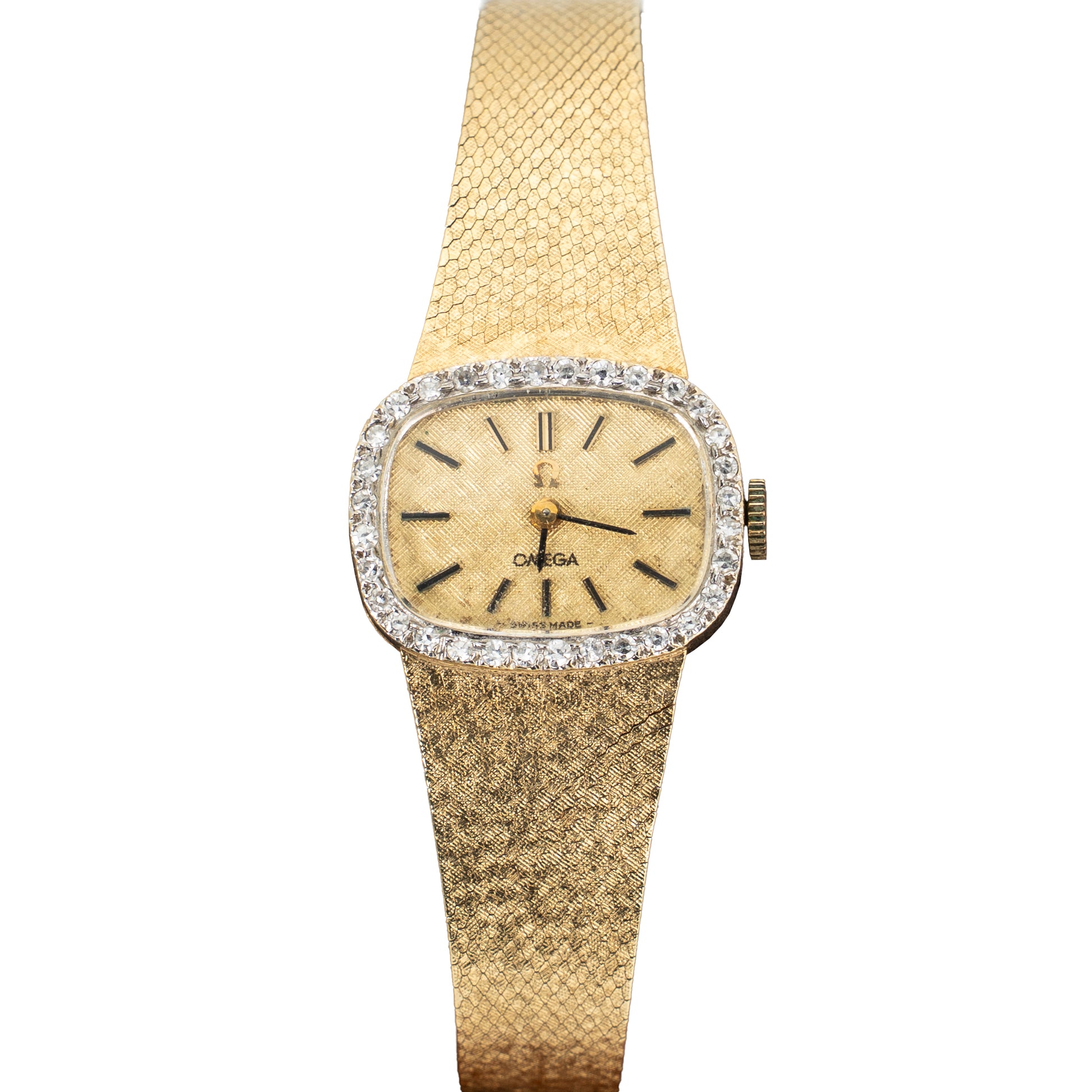 This is a Vintage Omega Ladies Watch, featuring a rectangular case and elegant integrated 14kt yellow gold mesh bracelet. The bezel is set with sparkling diamonds, and the watch is powered by a manual wind movement. Its champagne Florentine dial adds a refined vintage charm, perfectly suited for dress occasions. A timeless design from Omega’s golden era, ideal for collectors or those seeking a classic ladies’ piece.